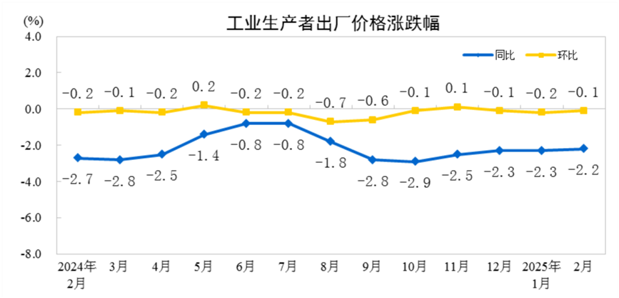 2025年2月份工业生产者出厂价格同比、环比降幅均收窄