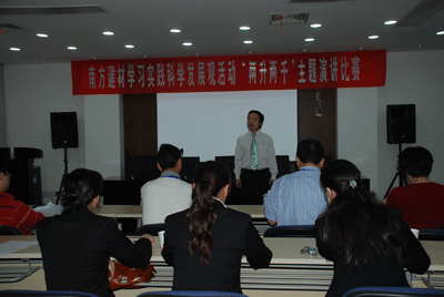 ??? 为进一步深入学习实践科学发展观活动,并为浙江省物产集团举办的演讲比赛选拔参赛选手,5月20日上午,公司在总部428会议室举办学习实践科学发展观“两升两千”( “两升”指“做大向做强升华,战略引领向价值观引领升华”, “两千”指“千方百计开拓市场,千锤百炼苦练内功”)主题演讲比赛。参赛选手从不同角度深情讲述身边人身边事,诠释南方建材切实践行科学发展观的内涵与意义,比赛现场气氛热烈。经过角逐,杨吴夏获得一等奖,邓佑波、杨欢获得二等奖,南方明珠酒店获得组织奖。