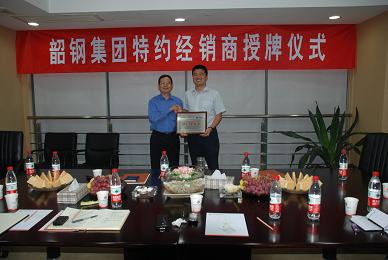 ???? 8月23日,广东韶钢集团总经理卢建华,韶钢松山股份有限公司销售部经理王学志专程来到我司,为我司颁发“韶钢钢材销售特约经销商”牌匾。公司袁仁军总经理、徐愧儒副总经理以及办公室、物流信息部、建材部、型材部负责人参加了授牌仪式。
