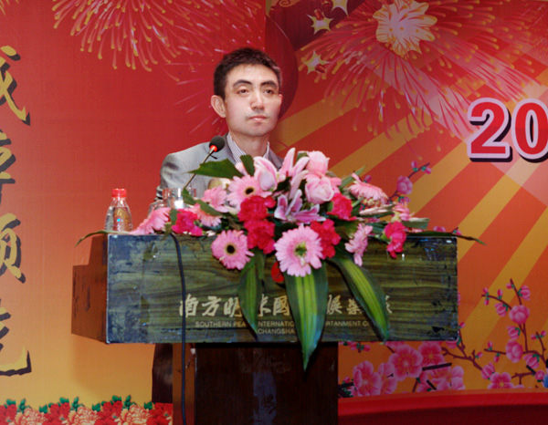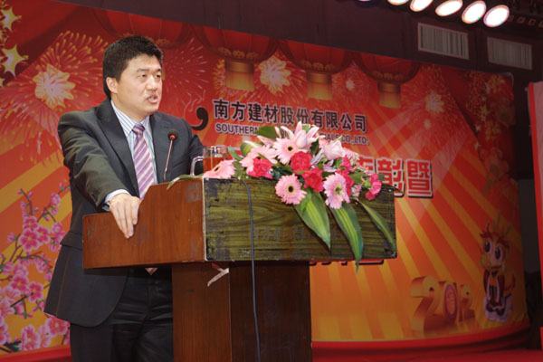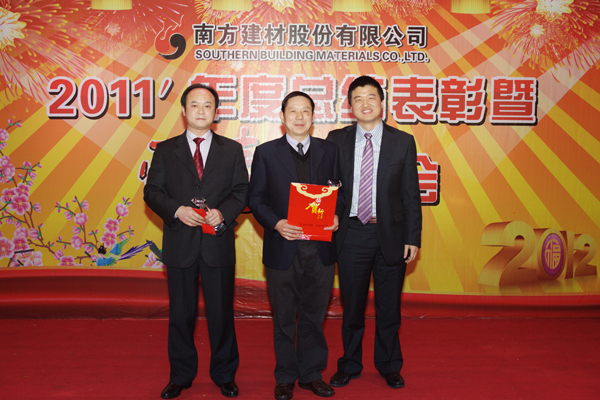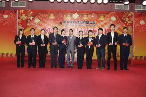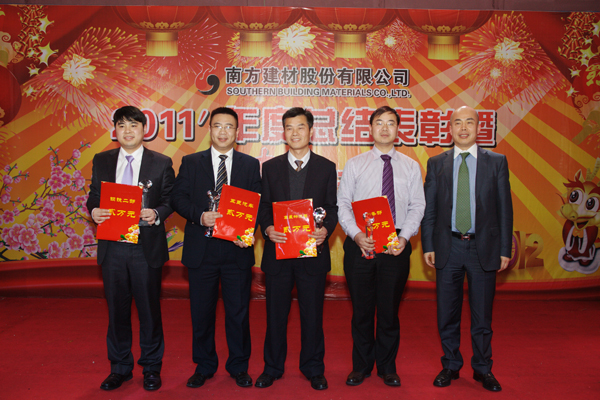 ??? 随后,张国强副总经理发表重要讲话。他充分肯定了公司取得的成绩。他指出,2011年,胡江潮董事长对南方建材作了“尽快实现在资本市场的蓝图”的指示,希望这一目标早日实现。2012年,物产集团董事会提出了“集成服务,成本领先,干在实处,走在前列”的要求,这四点要求对南方建材同样具有很强的指导意义。最后,张总宣读了胡江潮董事长的慰问短信:南方建材的全体员工,新年好!在过去的一年,你们征战中南六省一市,笑傲资本市场,扩大了物产版图,壮大了在资本市场的影响力,成就菲然。今天,我在风云浙商的颁奖现场,遥祝南方建材在龙年能龙腾四海,物泽八方,早日成为蓝筹绩效龙头股;员工们全家幸福安康。