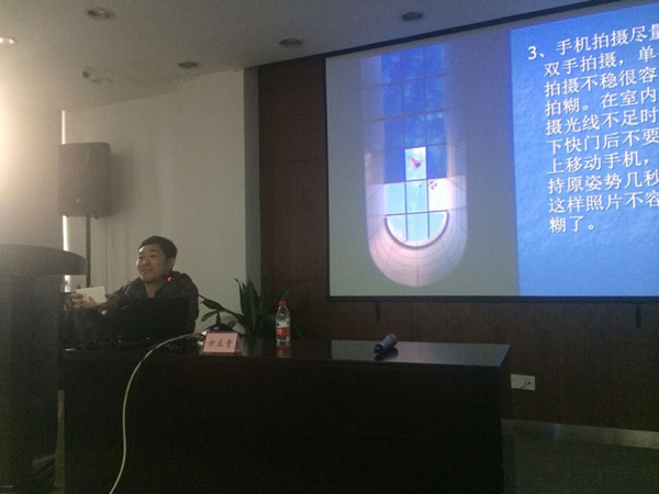 ????? 4月10日下午,3位摄影师先后就摄影基础知识、新闻摄影、微距与手机摄影等进行了详细讲课。老师们结合自己的摄影经历和作品,将理论知识与实践心得进行了一次深入浅出、形象生动的培训。