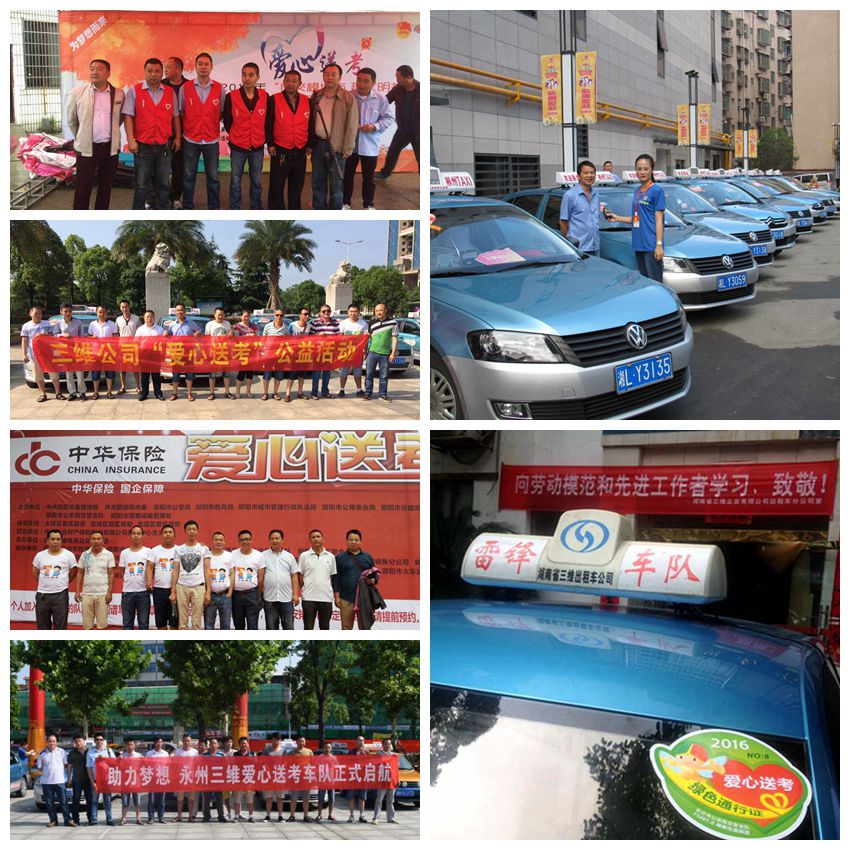 ????6月3日至6日,公司事业五部下属益阳三维、邵阳三维、永州三维、衡阳三维、长沙三维、岳阳三维、郴州三维、吉首三维八家出租车公司相继发布“爱心送考”启动仪式。高考当天,持有准考证的考生可以免费乘坐贴有“爱心送考”的三维的士。