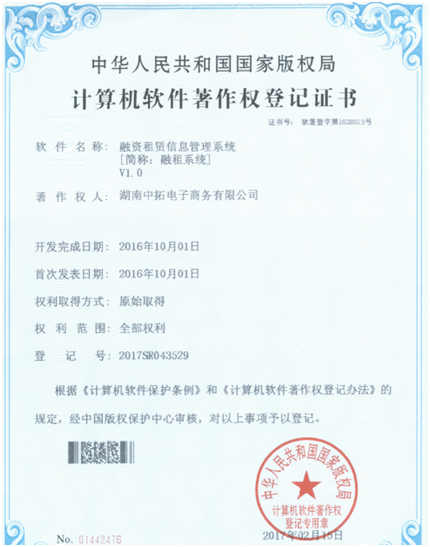 ??? 经过电商公司全体员工的不懈努力,2017年2月份公司产品市场采购平台和融资租赁系统取得中华人民共和国国家版权局计算机软件著作权认证。上述计算机软件著作权登记证书的取得有利于保护公司知识产权,增强核心竞争力,将对公司开拓市场,提升品牌影响力产生积极影响。(宁锋)